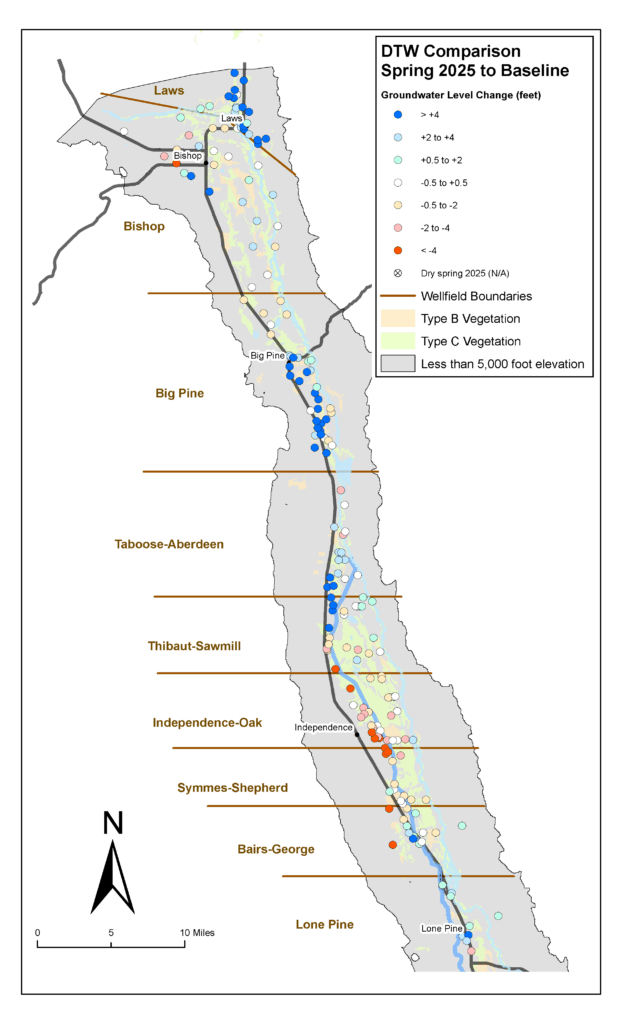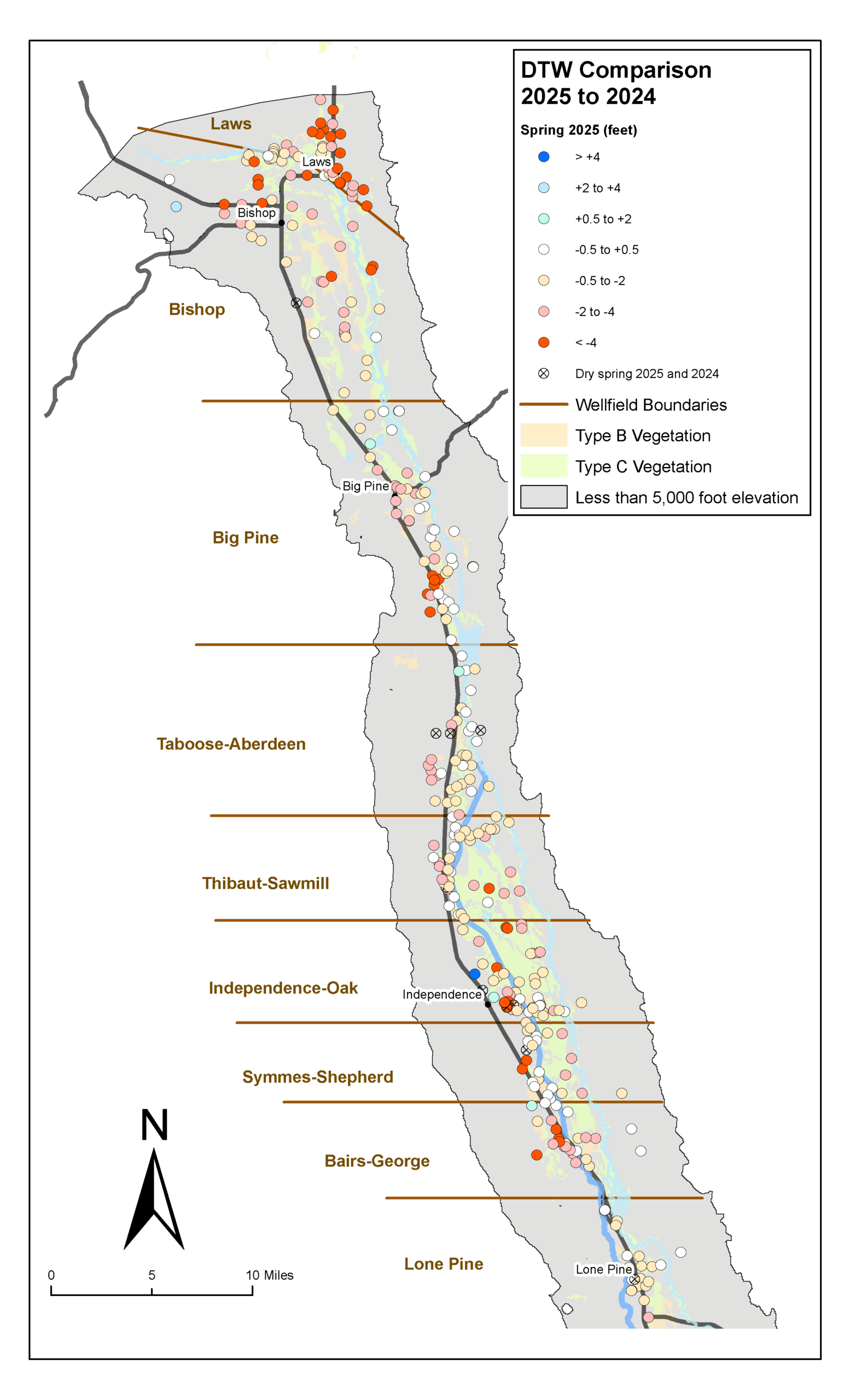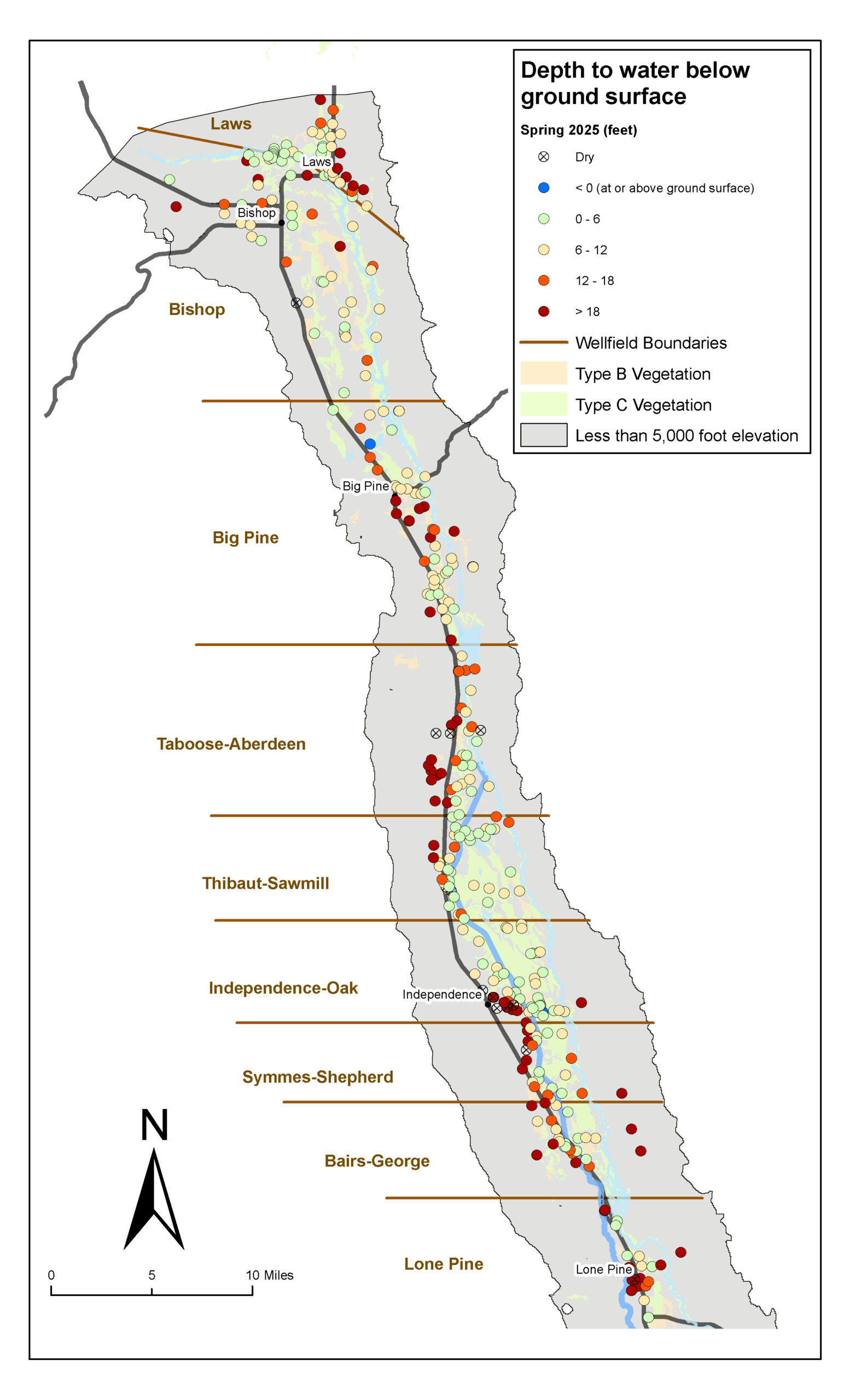 In late March or early April ICWD staff collects depth-to-water measurements from a suite of several hundred test wells including approximately 46 indicator wells annually to assist evaluation of LADWP operations plans. The figures below spatially display water levels from March/April in feet below the ground surface.