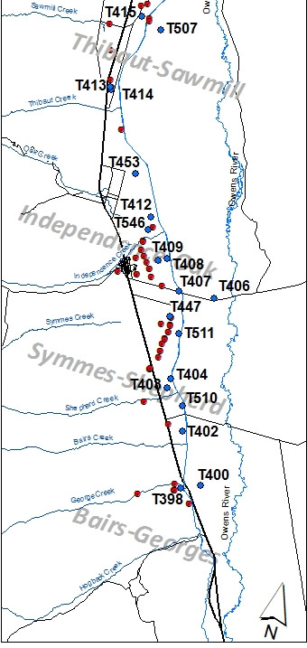 Indicator wells are shallow groundwater monitoring wells located in wellfields that have a relatively long period of record that have been chosen to indicate changes in groundwater levels as a result of LADWP pumping and runoff conditions. The ICWD uses empirical models for most of these wells to predict annual changes in water levels based on LADWP pumping in the wellfield and Owens Valley runoff amounts. Each April, ICWD hydrology staff measure water levels in these wells. At other times of the year, the wells are monitored by LADWP.