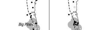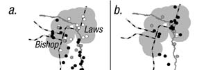 In the Laws area, north of Bishop, water tables were drawn down well below four feet between the baseline period and 1992 (Figure 2a). However, in 1999, several monitoring wells in the area were at baseline or above (Figure 2b). These high water table levels were the result of recharge induced by LADWP's operation of the McNally canals and water spreading in the Laws area during the summer of 1998. Water levels in some monitoring wells rose over 10 feet in that year. Water levels in the Laws area declined in 1999 in response to pumping and low recharge.