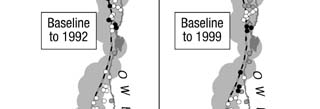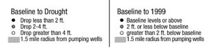 Figure 2a shows the magnitude of drawdown that occurred at 192 shallow monitoring wells between the baseline period for hydrology (1985 to 1987) and 1992, the last of six consecutive dry years. Figure 2b shows the difference between baseline water levels and April 1999 levels at 176 monitoring wells. The circles in this figure are shaded according to different criteria to show how close the test wells are to baseline levels. Baseline groundwater levels are the average April water levels from 1985 to 1987. The gray background shows the area within 1.5 miles of LADWP pumping wells.